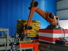包装合格的包装袋(包装箱)经输送机送到整平机,使袋形平整到达抓取辊道,机械手检测到抓取辊道上有包装袋(包装箱)后,抓起包装袋进行转向、堆放,将包装袋(包装箱)按照设置好的垛型进行码放,完成码垛工序。